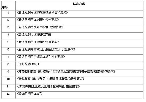 标准的目的在于加强生产的一致性、提升质量、并增进生产效率,若欲提升LED的制造质量,在全球化的竞争脱颖而出,标准是一项不可或缺的工具,因此加速对LED标准的制定是各国政府及业界非常重视的问题。2007年在半导体照明标准工作指导委员会的指导下,由“国家半导体照明工程研发及产业联盟”成立“联盟标准化协调推进工作组”,以负责协调中国的LED标准进度。而目前最新进展是由“全国照明电器标准化技术委员会”提出的普通照明用LED国家标准及行业标准等10多项标准目前都在送审阶段,预计于今年陆续颁布实施,如表所示。