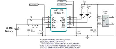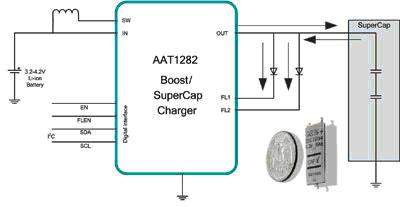 为更好地实现这一目标, AAT1282具有防止启动时过大尖峰电流冲击的内置电路、一个固定的800mA输入电流限制器、以及一个超级电容充满电后的负载断开电路。其输出电压受限于内部过压保护电路,可防止转换器和超级电容免受一个开路LED(开路条件下)的损害。