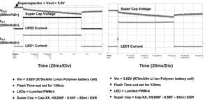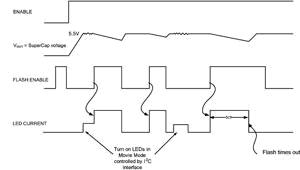 图3显示了采用2个以1A电流驱动的LED闪光灯和1个以2A电流驱动的LED闪光灯的测试结果。正如所见到的一样,超级电容可以很容易地提供闪光持续120ms所需的电流,同时保持电源电压充分地高于LED的VF电压。在两次闪光之间,超级电容以一个较慢的速率再充电,充电时间在外部设定,可针对不同的电池尺寸和化学原理进行优化。图4显示了闪光功能和电影模式选项的数字控制。