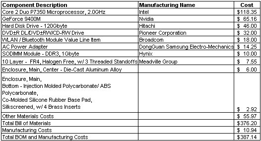这种新一代Mac Mini的入门级版本的材料成本是376.20美元,如果计入制造成本,则总成本升至387.14美元。这种低端型号的Mac Mini价格是599美元,这表明与苹果公司的iPod产品等低成本消费产品相比,其个人电脑的材料成本/制造利润相对较低。
