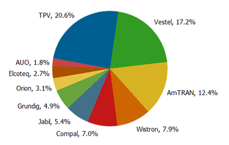 根据DisplaySearch 最新一季关于液晶电视供应链研究指出,2009年第一季全球液晶电视外包比率达25%,较上一季成长1%;主要的外包厂商有AmTRAN(瑞轩)、Compal(仁宝)、Grunding、Jabil(捷普)、Orion、TPV(冠捷)与Wistron(纬创)等。目前全球前十大电视品牌厂商除Vizio采100%外包策略,Philips约有62%外包,其余厂商仍以内制为主;不过由于液晶电视已成为商品化产品,为了提升市占率与优化供应链成本效率,部分品牌厂商拟增加在某些特定产品或地区的外包比重。