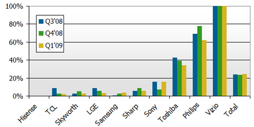- 2009年第一季全球液晶电视外包比率达25%,较上一季成长1%