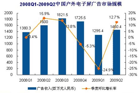易观国际分析认为,由于部分细分市场尚未走出宏观经济下滑的困境,加上整体市场的反弹并不强劲,因此本季度整体市场规模未达到去年同期的水平,预计目前中国宏观经济的好转对户外电子屏广告市场的促进作用将在下半年显现。