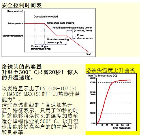 - 具备节能功能。当一段时间不使用烙铁时加热器温度会自动降低至设定的作业准备温度。 ( 当拿起烙铁手柄时温度会自动上升恢复至设定的作业温度 )