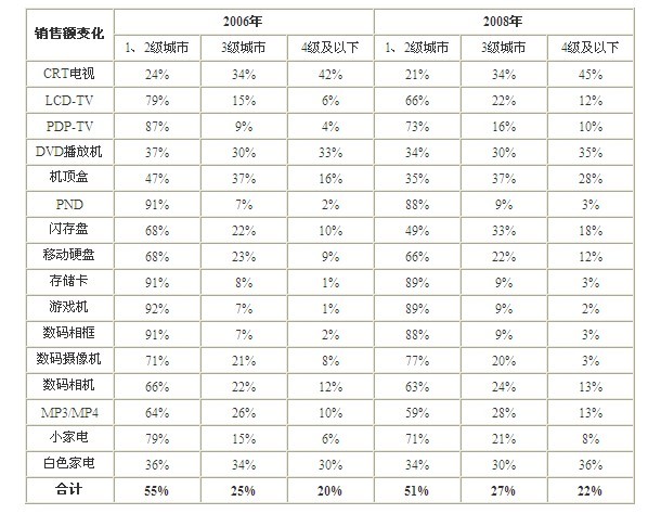 表1 2006年与2008年中国主要消费电子终端产品不同级别城市销售额结构变化