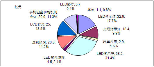- LED显示屏、LED指示灯、LCD背光以、手机键盘和相机闪光灯四大应用领域市场需求额占整体市场的73.9%
