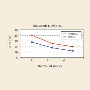横向和纵向结构两者ESR性能之间的差异如图2所示。这个例子是基于对D类电容器的理论计算,图2表明,两阳极横向结构与三阳极系统的纵向结构的ESR值相似。然而,相对而言横向结构在ESR上性价比优势更显著。