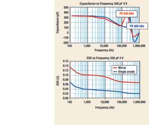 镜像结构如果使用更薄的阳极,电容将随频率下降至更低。镜像设计的共振频率改变,其原因是目前一般的DC/DC转换器其开关频率的工作范围(250~500kH)会因降低ESL而显著升高。
