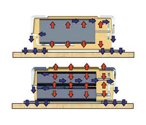 镜像设计的另一个好处是改善了其散热性能如图4所示,纹波电流在阳极产生的热量通过PCB板上的引线和钽丝得以发散冷却。