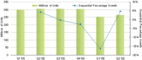 据iSuppli公司,第二季度全球手机出货量比第一季度增长4.7%,这是自2008年第三季度以来首次出现环比增长。第二季度全球手机出货量为2.65亿部,而第一季度是2.53亿部。