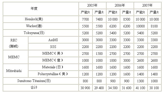 表1 2005-2007年国外硅材料企业的产能和产量情况