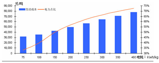- 国内企业在综合电耗高的在300kWh/kg以上,电耗低的则在200kWh/kg左右