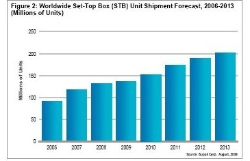 支持DVR的机顶盒增长也不慢,2013年以前的复合年增长率将达18%。硬件成本急剧下降,尤其是硬盘(HDD)成本,使得消费者更能买得起DVR HDD。但是,充当家庭媒体服务器的合家DVR的销售上升,将继续推动非DVR机顶盒的销售。在这种情况下,非DVR机顶盒充当含有硬盘的中央STB的客户机。