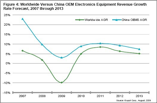 图4所示为iSuppli公司对2007年至2013年全球以及中国OEM电子设备营业收入增长率的预测。