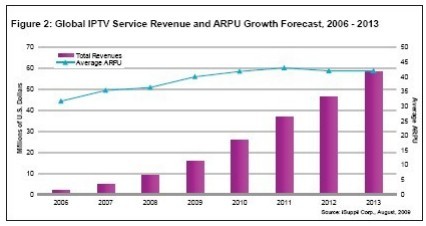 好消息是,在目前经济沉陷衰退之际,IPTV的好处已经显现出来。2008 年第四季度和2009 年第一季度,IPTV经受住了经济衰退的冲击,2009年有望增长 56%,用户数量增到 3330万个。2008年全球用户数量是 2130万。