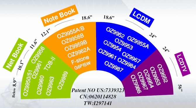 基于这样的技术积累,目前凹凸科技已成为拥有最广泛LCD背光驱动IC产品线的厂商,如图1所示,从上网本到笔记本电脑再到LCD显示器???、LCD TV,尺寸从8.9吋横跨到56吋,凹凸科技能提供满足各类应用需的相应LED驱动器解决方案(具备不同的效率等级、PWM接口、不同通道数),包括3x9、4x7、4x8、6x10、8x8、8x9等不同配置。多种技术特性如集成高速PWM功能、采用快速切换的开关模式、突波模式与相移技术,及其专有的区域照明等技术,则可帮助开发人员解决多串数LED均流、LED线性调光所产生的噪声、功率耗散,以及厂商对于?;す娓褚蟛灰坏忍粽健?br />