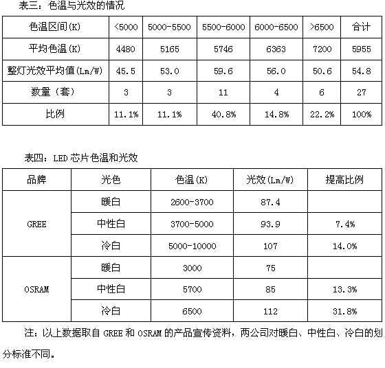 众所周知,LED路灯的光效与色温密切相关。从表四可看出,GREE芯片不同色温的光效差别不大,但OSRAM芯片则不然,不同色温的光效差别较大,6500K芯片比5700K芯片光效提高31.8%。因此,LED路灯必须在色温与光效之间取得平衡,既要充分考虑市民的舒适感和满意度,也不能为追求低色温而大幅牺牲光效。毕竟,照度和功率密度值是《城市道路照明设计标准》(CJJ45-2006)的硬指标,必须有较高光效才能满足要求。同时,由于不同色温芯片的价格差别较大,成本因素也需要认真考虑。
