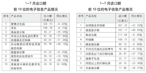 图一:1~7月出口额(进口额)钱10位电子信息产品情况
