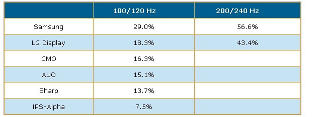 根据DisplaySearch调查指出,第二季全球采用倍频及双倍频扫描技术液晶电视面板出货达到640万片,出货量市占率达18.3%,较上一季提高2%。以厂商别来看,Samsung以29%市占率居100/120Hz出货量排名冠军,LG Display以18.3%是占率居次,CMO(奇美)、AUO(友达)、Sharp与IPS-Alpha分居第三到六名。在双倍频面板出货量方面,主要为韩国二家面板厂商所主导,市占率如表二所示。