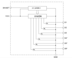 该器件主要特点:输入电压范围为1.8~5.5V;内部有6个低端N沟通MOSFET开关,每个开关都是独立的;可采用单个串行控制线(S2C线)对各个开关实现通、断控制;静态电流少,典型值为3μA;每个开关可驱动208mA;无须其他外围元件;12引脚TSOP封装;工作温度范围-40~+85℃。