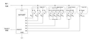 如果有需要也可并接多个RGBLED。S4接D1~D4白光LED,它用作彩色主显示屏背光照明,S6接闪光灯LED,作相机闪光灯用。根据手机的不同工作状态,由μP向EW/SET输入不同的数字信号,可实现LED的负载管理。数字信号的频率可高达1MHz。利用输入EN/SET信号使LED亮的时间与灭的时间交替进行,改变亮、灭的时间,可以实现LED亮度调节。