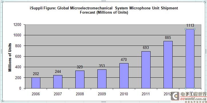 2013年,全球MEMS麦克风出货量将从2008年的3.285亿个成长至11亿个。不过,在2009年期间,由于经历了史上罕见的全面性衰退,MEMS麦克风的强劲成长态势将会减缓。