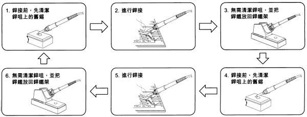 这可以减低烙铁头的氧化机会,使烙铁头更耐用。使用后,应待烙铁头温度稍为降低后才加上新焊锡,使镀锡层有更佳的防氧化效果。(图5)