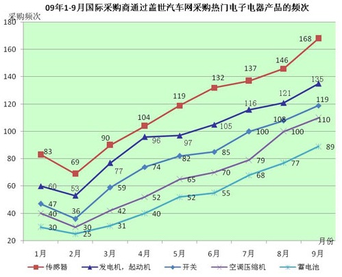 与此相对应,据全球领先的专业汽车零部件电子商务平台—盖世汽车网的统计数据显示,09年2-9月,国际采购商通过盖世汽车网采购的汽车电子电器产品均呈现出大幅度增长之势(如下图所示)。其中,热门采购产品主要有传感器、发电机/起动机、开关、空调压缩机、蓄电池等,平均每月采购频次分别为120、100、82、 68、54以上。与2月份相比,9月份热门采购产品的采购量增长幅度均达2-3倍。