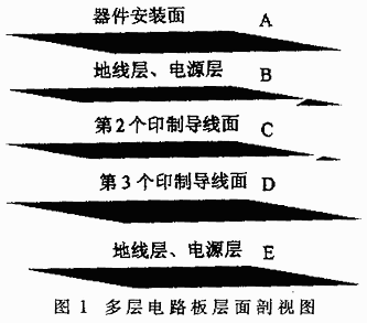 采用多层布线方式,电源、地线和信号分别占有独立的层面(如图1所示),这样由整个层面构成的电源线和接地线阻抗相当低。电路板的分布电容由各层之间的距离和介电系数来决定,约为10~1000pF/cm2。图1中的E层上下表面经过绝缘处理,既能预防线路板向外辐射噪声,又能防止线路板接受外来噪声;同时,电源线被密封在板内,几乎不接受任何外来噪声,而且内部几个供电面之间有很大的静电电容,形成阻抗极低的供电线路,极大地提高了抗噪性能。