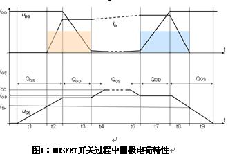 功率MOSFET管的栅极电荷特性如图1所示,此特性图可以在MOSFET数据表中查到,开通的工作过程可以参阅相关的文献。值得注意的是:下面的开通过程对应着BUCK变换器上管的开通状态,对于下管是0电压开通,因此开关损耗很小,可以忽略不计。