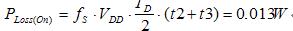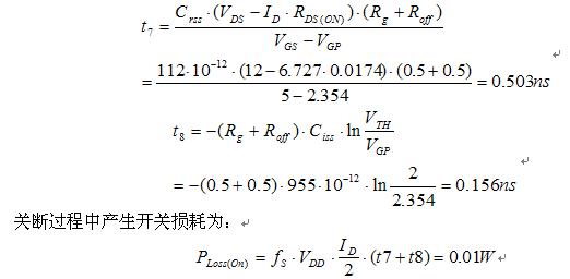 MOSFET开通损耗主要发生t2和t3时间段。下面以一个具体的实例下计算。输入电压12V,输出电压3.3V/6A,开关频率350kHz,PWM栅极驱动器电压为5V,导通电阻1.5Ohm,关断的下拉电阻为0.5Ohm,所用的MOSFET为AO4468,具体参数如下:Ciss= 955pF,Coss= 145pF,Crss= 112pF,Rg= 0.5Ohm;当VGS= 4.5V,Qg= 9nC;当VGS=10V,Qg= 17nC,Qgd= 4.7nC,Qgs= 3.4nC;当VGS=5V且ID=11.6A,跨导gFS= 19S;当VDS=VGS且ID=250uA,,VTH= 2V;当VGS= 4.5V且ID=10A,RDS(ON)=17.4mOhm。