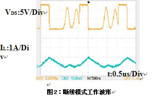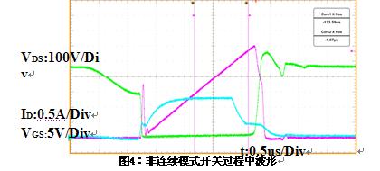 注意到图1是基于连续电流模式下所得到的波形,对于非连续模式,由于开通前的电流为0,所以,除了Coss放电产生的功耗外,没有开关的损耗,即非连续模式下开通损耗为0。但在实际的检测中,非连续模式下仍然可以看到VGS有米勒平台,这主要是由于Coss的放电电流产生的。Coss放电快,持续的时间短,这样电流迅速降低,由于VGS和ID的受转移特性的约束,所以当电流突然降低时,VGS也会降低,VGS波形前沿的米勒平台处产生一个下降的凹坑,并伴随着振荡。