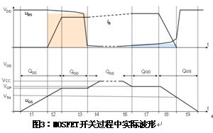 图1中VDS的电压波形是基于理想状态下,用工程简化方式来分析的。由于Coss存在,实际的开关过程中的电压和电流波形与图1波形会有一些差异,所图3所示。下面以关断过程为例说明?;诶硐胱刺拢怨こ碳蚧绞?,认为VDS在t7时间段内线性地从最小值上升到输入电压,电流在t8时间段内线性地从最大值下降到0。
