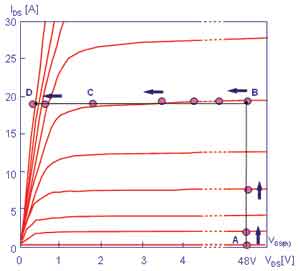 开通前,MOSFET起始工作点位于图3的右下角A点,AOT460的VDD电压为48V,Vgs的电压逐渐升高,Id电流为0,Vgs的电压达到VGS(th),Id电流从0开始逐渐增大。