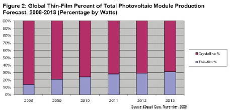 碲化镉(CdTe)是当今最大的商业薄膜技术,First Solar是主要供应商。 按功率计算,CdTe占2009年薄膜产量的53%。它将继续是占主导地位的薄膜技术,但iSuppli公司预测,先进的aSi/μSi技术,即串联和三结,以及CIS/CIGS 技术,到2013年会与碲化镉平分秋色。