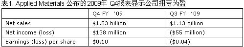 Applied Materials 近日公布的09年第4季财报显示公司已扭亏为盈,净收入实现1.38亿美元,而上季亏损为5500万美元。其Q4销售额为15.3亿美元,其中半导体设备销售占6.56亿美元,公司同时已收到了6.29亿美元的半导体设备新订单。
