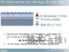 - IMEC的目标是实现在硅底板上形成硅纳米线的太阳能电池,转换效率将达到约33%