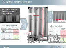 目前,IMEC正在尝试试制适于太阳能电池的硅纳米线。要实现1.7~1.8eV的带隙,硅纳米线的直径需要降至2~4nm。为形成这种极细的硅纳米线,IMEC采用了为制造新一代半导体而开发的EUV曝光。