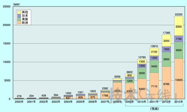 - 2013年欧洲市场的扩大率将为2008年的2.4倍,达到1万925MW