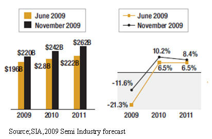 SIA在今年6月时曾预测09年全球半导体业下降21%,销售额为1956亿美元,紧接着2010年增长6.5%,为2083亿美元及2011年达到2219亿美元。