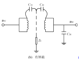 由于C2是屏蔽层的对地阻抗,在低频范围内,ZE《(1/jωC10),所以u2C→0。由此可见,采取屏蔽措施后,通过隔离变压器的共模噪声电压被大大地削弱了。