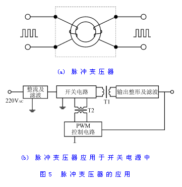 脉冲变压器的匝数较少,而且一次绕组和二次绕组分别绕于铁氧体磁芯的两侧,这种工艺使得它的分布电容特小,仅为几个pF,所以可作为脉冲信号的隔离元件。脉冲变压器传递输入、输出脉冲信号时,不传递直流分量,因而在微电子技术控制系统中得到了广泛的应用。一般地说,脉冲变压器的信号传递频率在1kHz~1MHz之间,新型的高频脉冲变压器的传递频率可达到10MHz。图5(a)是脉冲变压器的示意图。脉冲变压器主要用于晶闸管(SCR)、大功率晶体管(CTR)、IGBT等可控器件的控制隔离中。图5(b)是脉冲变压器的应用实例。