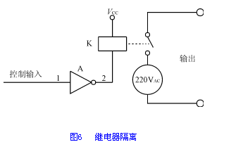 继电器是常用的数字输出隔离元件,用继电器作为隔离元件简单实用,价格低廉。图6是继电器输出隔离的实例示意图。在该电路中,通过继电器把低压直流与高压交流隔离开来,使高压交流侧的干扰无法进入低压直流侧。