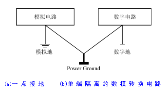 一般地说,模拟电路与数字电路之间的转换通过模数转换器(A/D)或数模转换器(D/A)来实现。但是,若不采取一定的措施,数字电路中的高频振荡信号就会对模拟电路带来一定的干扰,影响测量的精度。为了抑制数字电路对模拟电路带来的高频干扰,一般须将模拟地与数字地分开布线,参见图7(a)。这种布线方式不能彻底排除来自数字电路的高频干扰,要想排除来自数字电路的高频干扰,必须把数字电路与模拟电路隔离开来,常用的隔离方法是在A/D转换器与数字电路之间加入光电耦合器,把数字电路与模拟电路隔离开,参见图7(b)。但这种电路还不能从根本上解决模拟电路中的干扰问题,仍然存在着一定的缺陷,这是因为信号电路中的共模干扰和差模干扰没有得到有效的抑制,对于高精密测量的场合,还不能满足要求。对于具有严重干扰的测量场合,可采用图7(c)所示的电路。在该电路中,把信号接收部分与模拟处理部分也进行了隔离,因为在前置处理级与模数转换器(A/D)之间加入线性隔离放大器,把信号地与模拟地隔开,同时在模数转换器(A/D)与数字电路之间采用光电耦合器隔离,把模拟地与数字地隔开,这样一来,既防止了数字系统的高频干扰进入模拟部分,又阻断了来自前置电路部分的共模干扰和差模干扰。当然,这种系统的造价较高,一般只用于高精度的测量系统中。