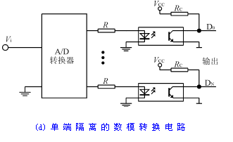 数模转换(D/A)电路的隔离与模数转换(A/D)电路的隔离类似,因而所采取的技术措施也差不多,图7(d)是数模转换(D/A)电路的隔离方法之一。