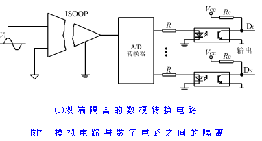 模拟电路与数字电路之间的隔离主要采用模/数转换装置;对于要求较高的电路,除采用模/数转换装置外,还应在模/数转换装置的两端分别加入模拟隔离元器件和数字隔离元器件。