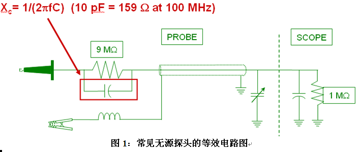 从无源探头的原理来看,如图1所示为常见的无源探头的简化电路图,通常示波器标配的无源探头的直流输入电阻为10兆欧(探头的9兆欧与示波器前端1兆欧串联),输入电容为10pf左右,与9兆欧电阻并联。当待测试信号的频率较高时,容抗随着频率升高而减小,所以无源探头整体的输入阻抗变小,当频率为100MHz时,输入阻抗为159欧。