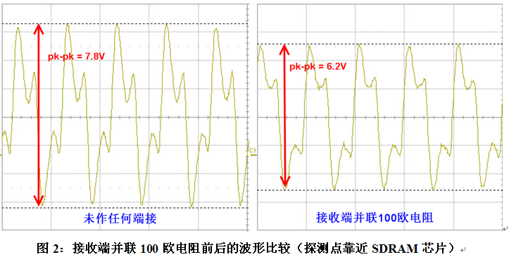 几天后,我们在实验室重新测试了该系统的时钟,测试仪器为SDA816Zi(带宽16G,采样率40G),探头为ZS1500(带宽1.5GHz)。由于待测试信号频率仅为100MHz,所以通常1G以上示波器和探头足以满足需求(注:对于某些上升时间很快的时钟,比如PCIExpress的100MHz时钟,1GHz的带宽是不够的,需要更高带宽的示波器)。下图2左图为未作端接时在SDRAM芯片端测量时钟波形,右图为靠近SDRAM颗粒并联100欧电阻后的波形,两者相比,前者的过冲高达7.8V,电路板不能正常工作;而后者过冲较小,电路板可以正常工作。