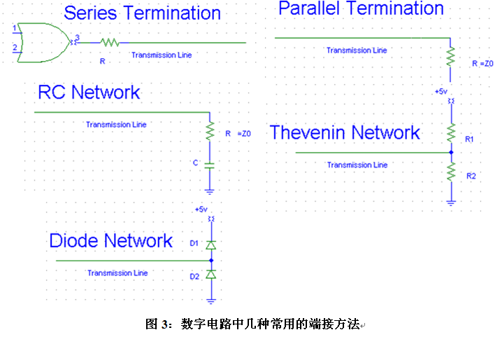 尽管并联了100欧电阻后电路板能正常工作了,但是接收端测量到的峰峰值高达6.2V,对于SDRAM芯片3.3V的工作电压来讲还是比较大的,长期工作可能会导致内存芯片出问题,所以,我们还需改进端接策略。在信号完整性书籍中,通常有串联匹配、并联匹配、RC网络、戴维南网络等端接方法,如下图3所示。相比并联匹配,串联匹配不用提供DC电流到地或者电源,不会对输出的高低电平产生影响,能减小过冲和EMI,所以我们接着尝试串联匹配下的信号质量。