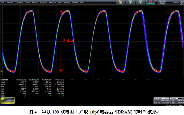 由于电路中ARM的MCU输出的一路100MHz时钟要驱动两个SDRAM芯片,布线上MCU出来的时钟刚出来就分成两路后连向两个SDRAM的时钟引脚,所以我们采用了在两路时钟分支上同时串联100欧电阻加并联10pf电容的端接方法。在PCB上割线,焊上电阻和电容后测量的结果如下图4所示,改进后的时钟峰峰值为3.44V,波形无过冲,信号质量良好。电路板系统运行正常。